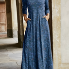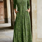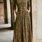 Adeline er en stilig, lang kjole med retro-mønster som forener tidløs sjarm med en moderne følelse. Kjolen viser et interessant retro-design som minner om gamle veggtepper og blomster, og skaper en elegant og nostalgisk stil.