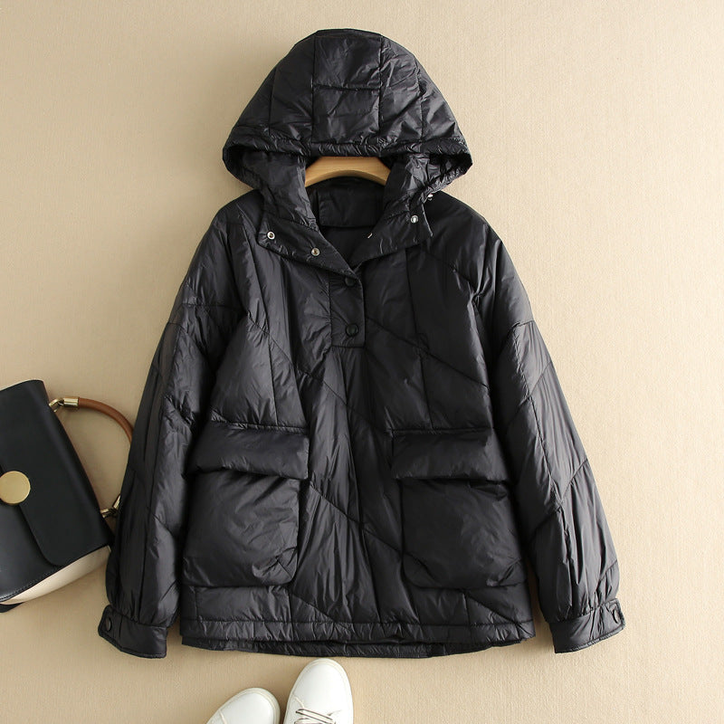 Amery jakken er det beste valget for kalde vinterdager. Med sin løse stil, praktiske hette og nyttige lommer gir den både komfort og funksjonalitet. Det høykvalitets dunet holder deg varm, mens den enkle sorte fargen gir et klassisk utseende. Enten i byen eller på vinterlige turer – denne jakken er en uunnværlig følgesvenn.