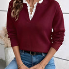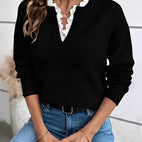 Corrina-genseren kombinerer fint strikkedesign med et snev av eleganse. Det myke materialet gir en behagelig følelse, mens de delikate blondedetaljene gir looken et feminint preg. Ideell for hverdag, arbeid eller avslappede møter – en stilfull følgesvenn i enhver sesong.