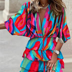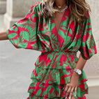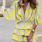 Kjole for Kvinner – V-utringning – Blomstermønster – Rynker – Flaggermusermer – Elastisk Midje: Oppdag denne elegante kjolen med et vakkert blomstermønster, en flatterende V-utringning, lekne rynker og komfortable flaggermusermer.