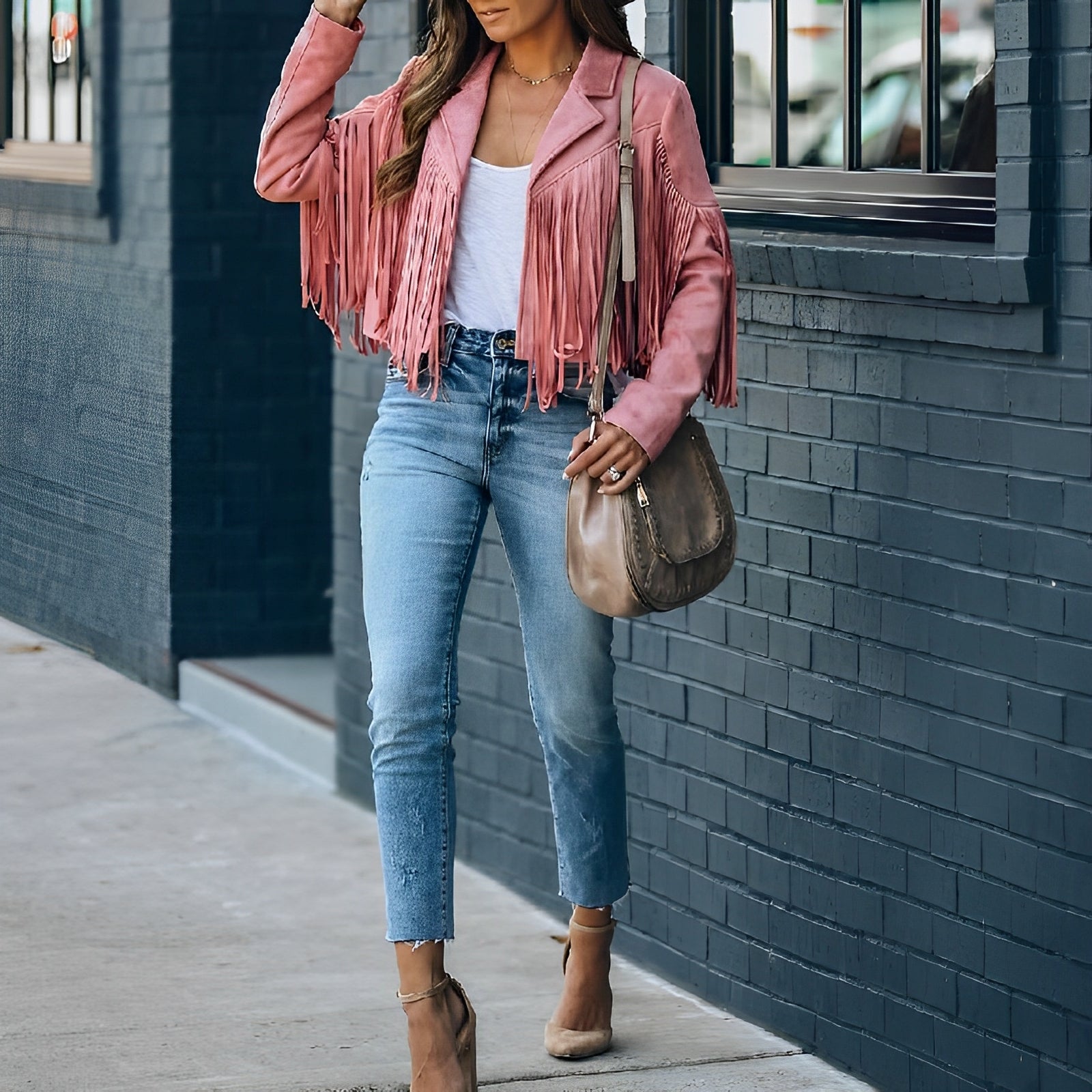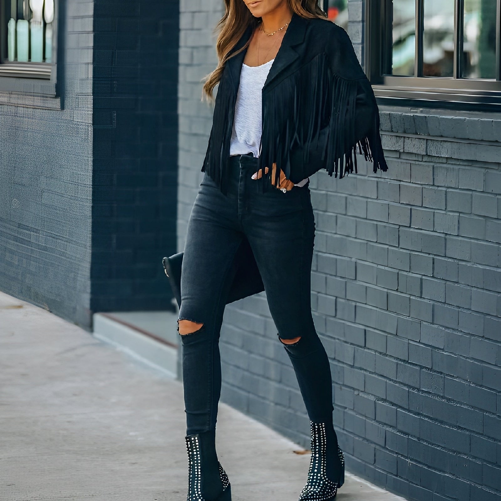 - Stilige frynsedetaljer: De lange frynseaksentene gir tekstur og en boho-stil, noe som gjør denne jakken til et fremtredende stykke i enhver kolleksjon.