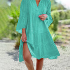 Adopter den boho-chic stilen med Mia, en rett kjole i bomullsblanding med geometrisk mønster. Dens vide og flytende snitt, dens V-hals og dens 3/4 utsvingte ermer gir komfort og eleganse i hverdagen. Perfekt for vår, sommer og høst, den kan brukes både i byen og på ferie.