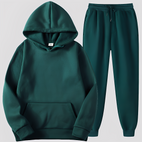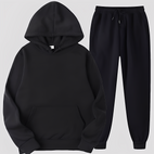 Dette todelte sportsettet består av en myk materialblanding som gir bevegelsesfrihet og høy komfort. Settet inkluderer en hettegenser og en matchende joggebukse for et harmonisk antrekk. Ideelt for sportslige aktiviteter eller avslappende dager hjemme, sørger det fleksible materialet for en behagelig følelse på huden. Praktiske detaljer som ribbestrikkede mansjetter og justerbar hette kompletterer det funksjonelle designet.